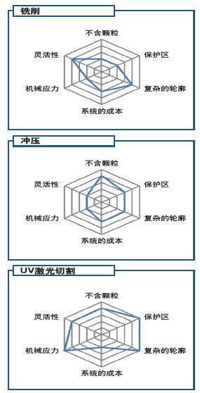 SMT后分板即切割多種電子元器件已被裝配的電路板,該工序已經(jīng)處在生產(chǎn)鏈的末端。對于分板,可選擇不同的技術(shù):對于通常用的PCB,優(yōu)先考慮使用傳統(tǒng)的刀切、沖壓和輪廓銑削等工藝。對于較為復(fù)雜的電子線路以及薄型基板尤其是對機械應(yīng)力、粉塵和尺寸偏差非常敏感的情況,則采用UV激光切割分板更有優(yōu)勢。以下三個圖表從不同因素對這三種方法進行了評估。