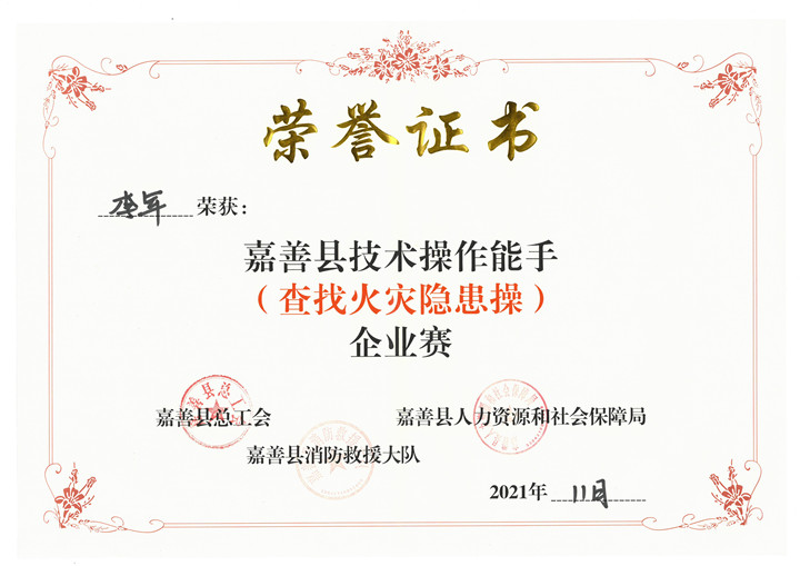 熱烈祝賀公司李軍榮獲嘉善縣(查找火災隱患操)企業賽技術操作能手