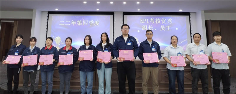 首先舉行二O二二年第四季度評優表彰會,表彰會上共表彰了KPI考核優秀課長及工程師14名、KPI考核優秀組長及員工12名、優秀合理化方案提案及實施者12項、內控工作先進者2名,分別頒發榮譽證書和獎金。